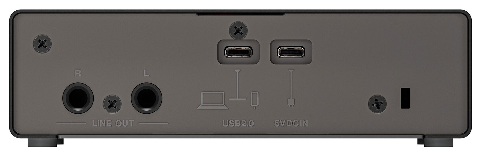 - 2 TRS-Line-Ausgänge, 1 Kopfhörerausgang, der über die Ausgangslautstärke gesteuert wird