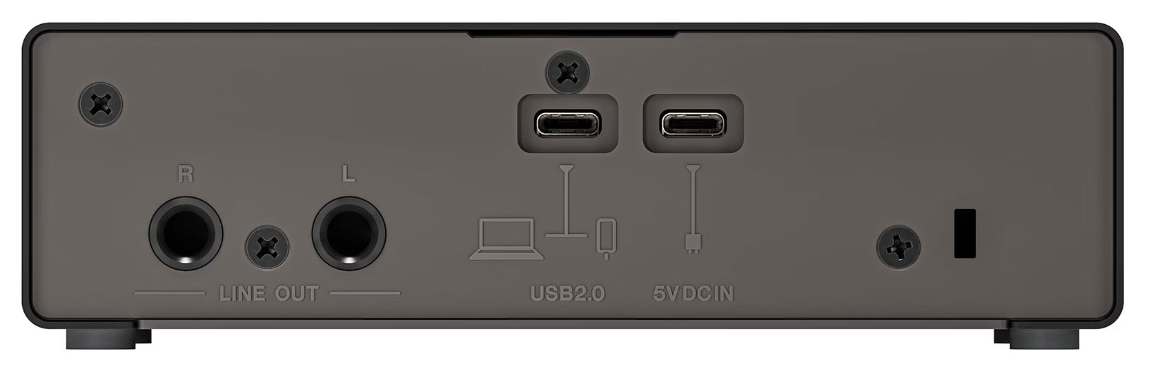 - 2 TRS-Line-Ausgänge, 1 Kopfhörerausgang, der über die Ausgangslautstärke gesteuert wird
