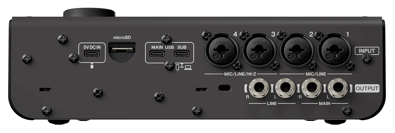 - 4 Mikrofon-/Line-Eingänge (2 Kombi-Anschlüsse/3,5mm Headset-Mikrofon, 2 Kombi-Anschlüsse mit Hi-Z), 1 AUX-Eingang (3,5mm Klinke)